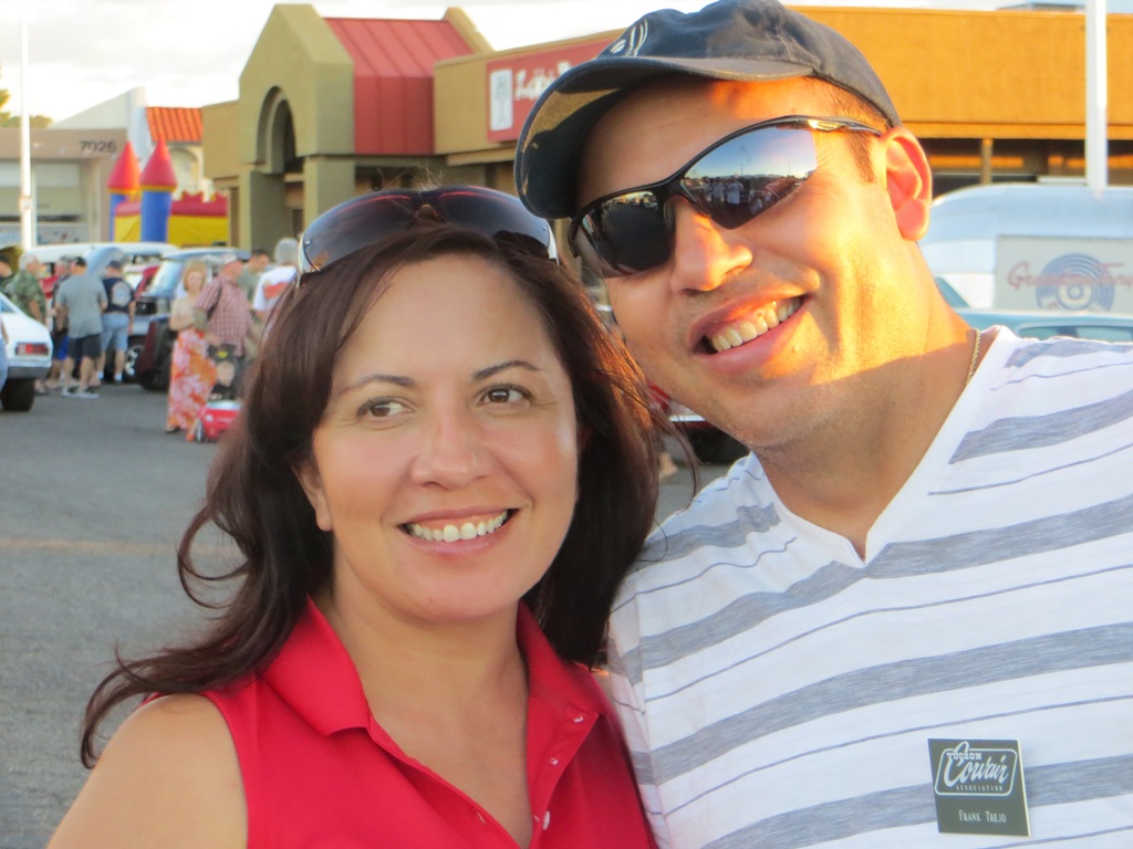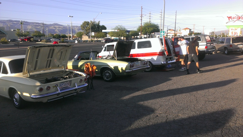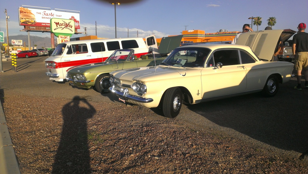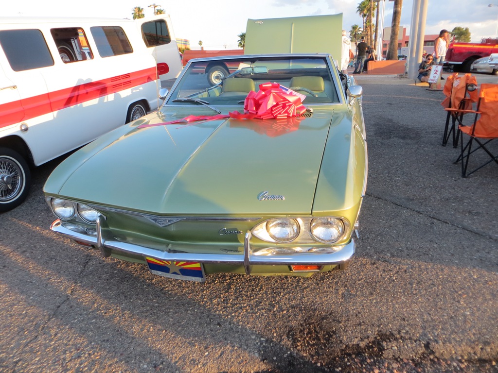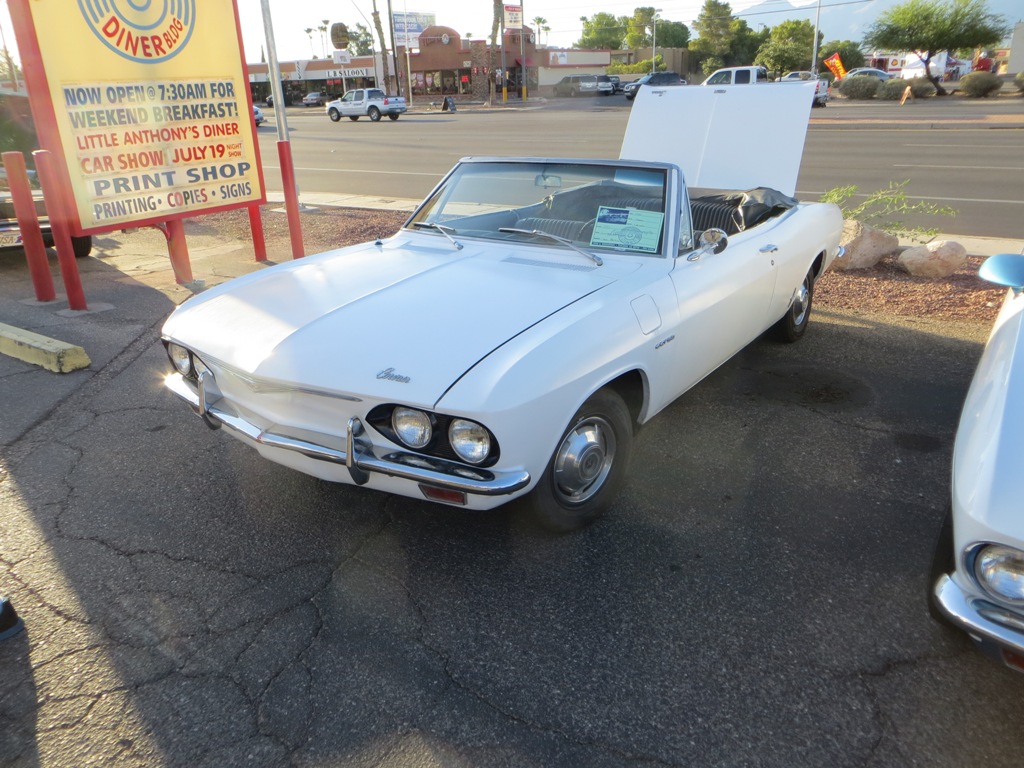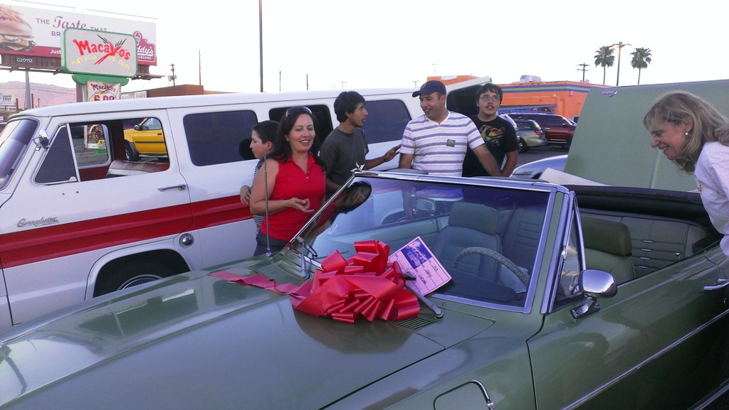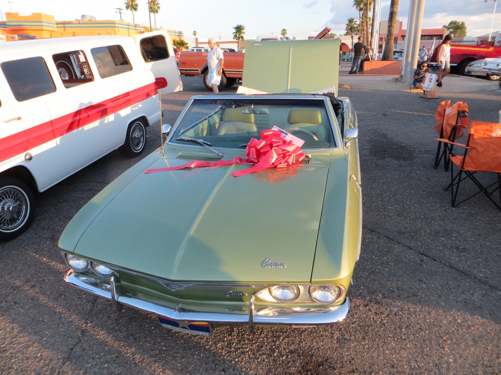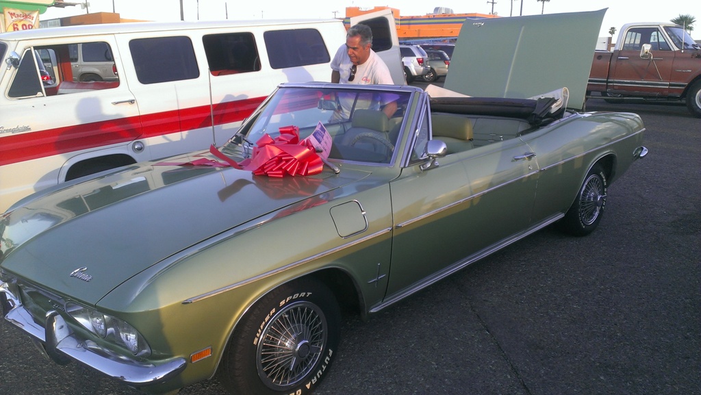 TCA showed up at Little Anthony's Diner on Saturday night, July 19, 2014 with 5 Corvairs and a pickup truck. The treat of the evening was Gloria Trejo receiving a brand new 1969 Corvair convertible as a birthday present from her husband Frank.