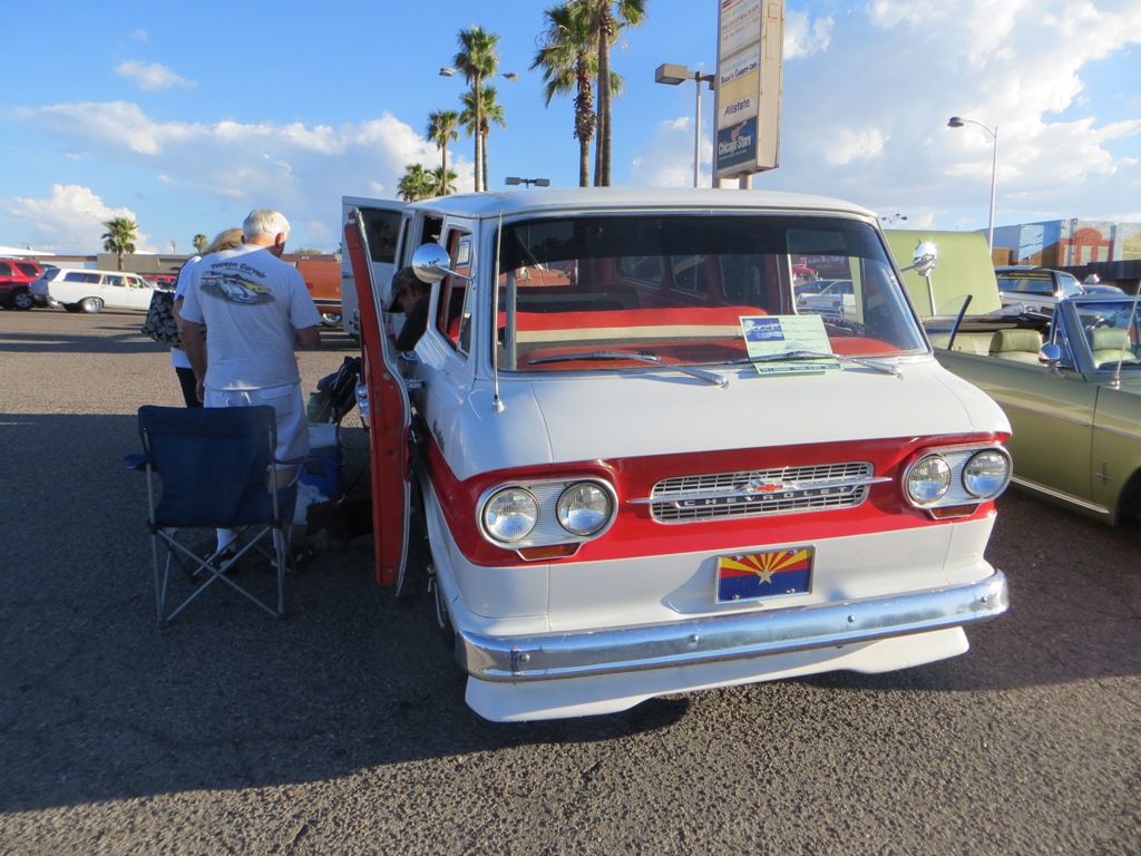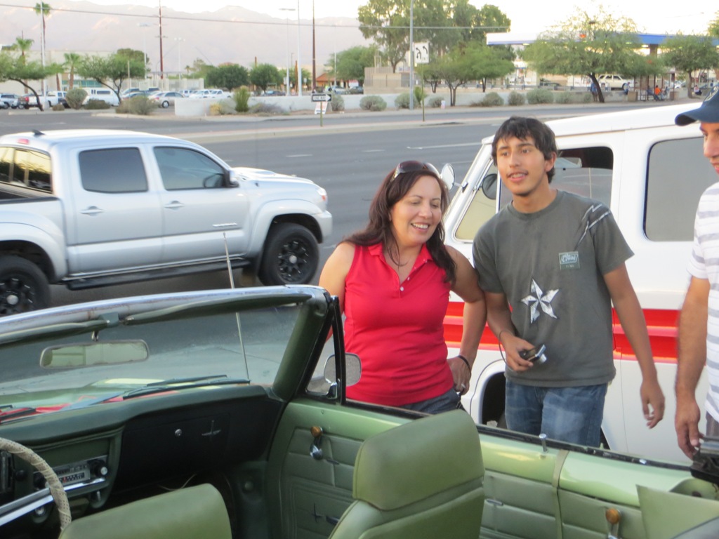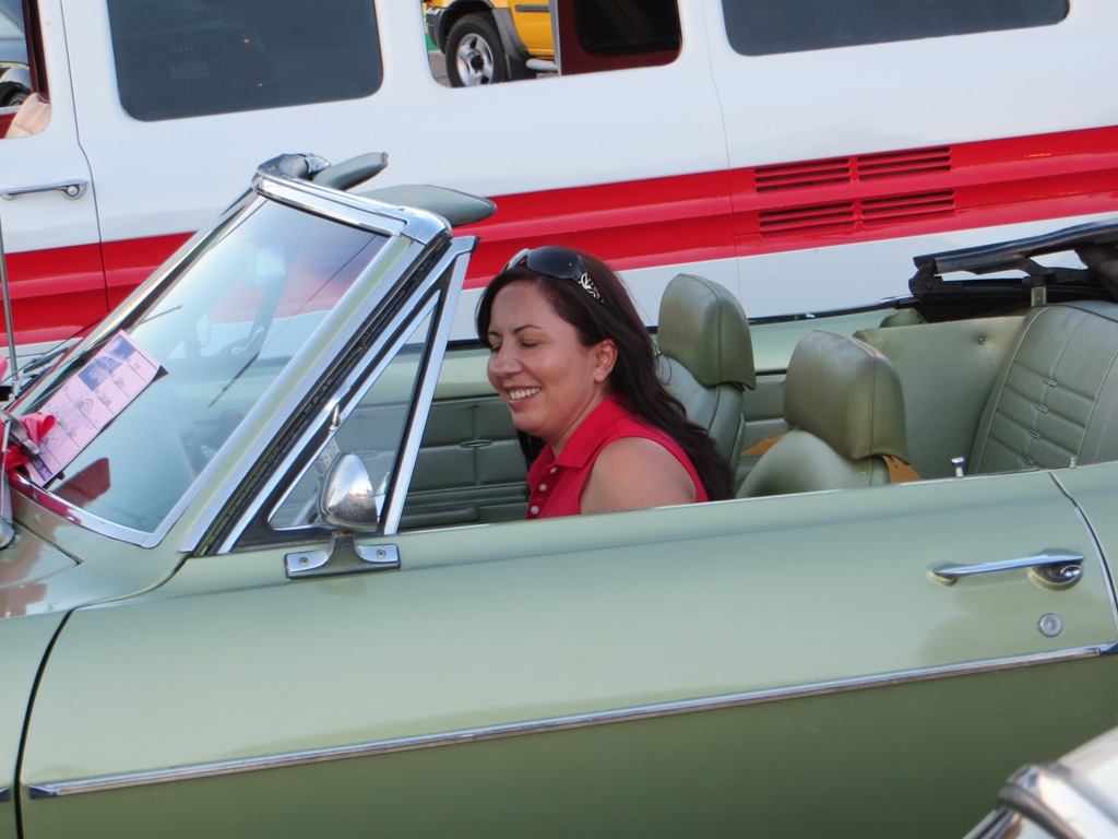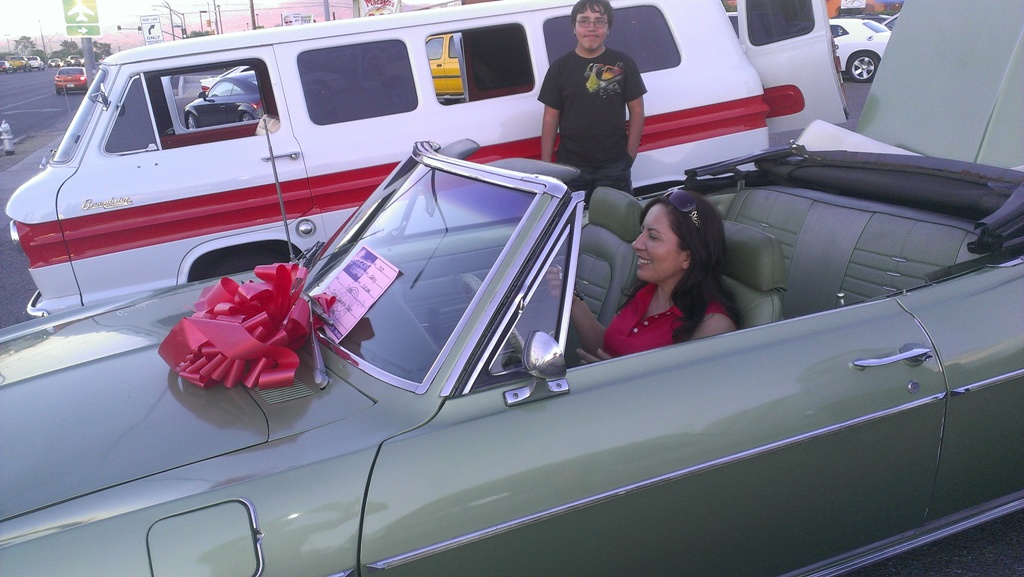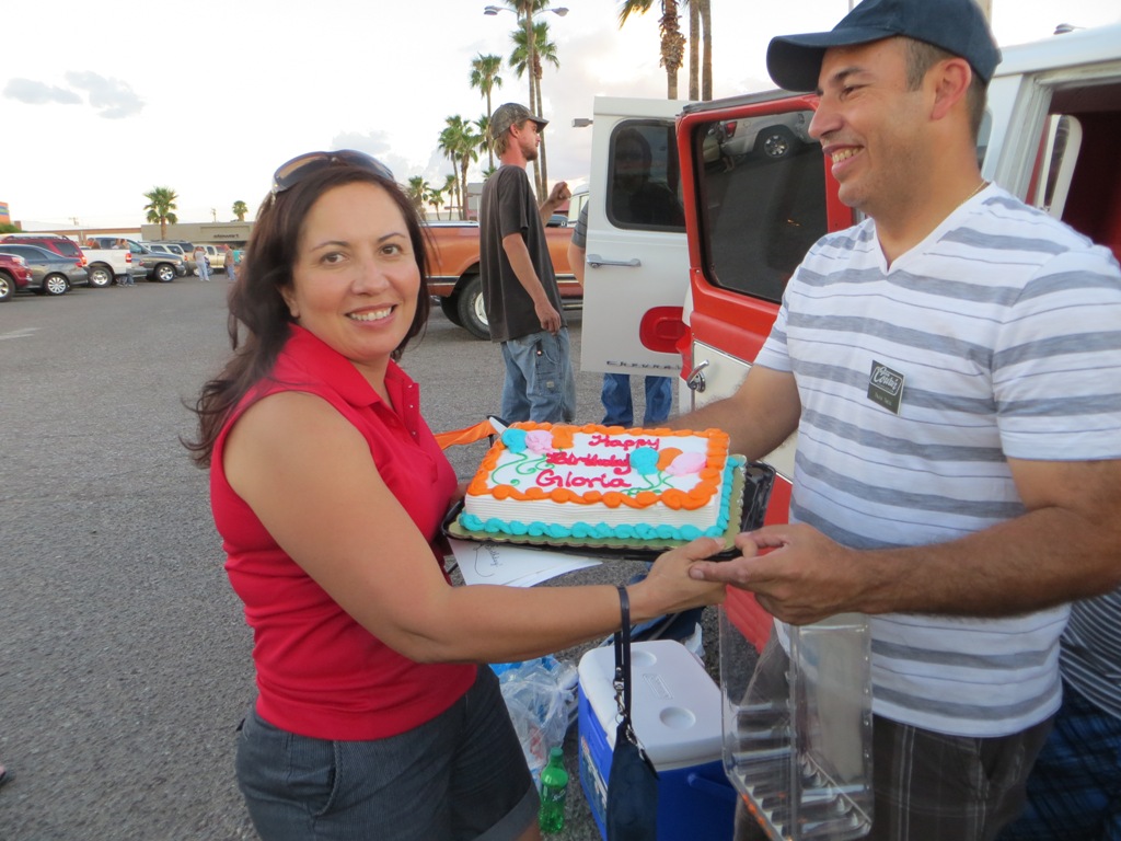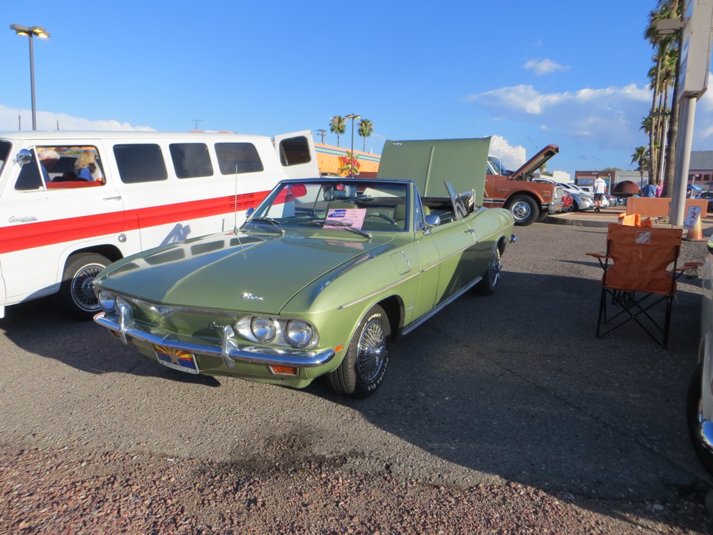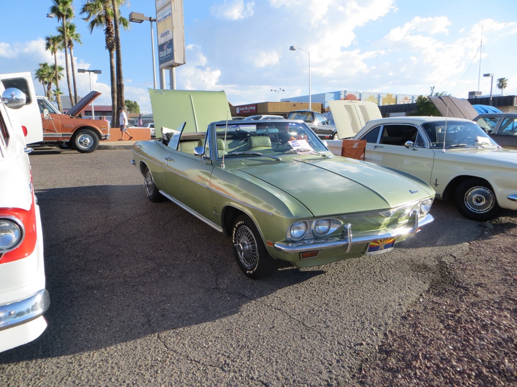 TCA showed up at Little Anthony's Diner on Saturday night, July 19, 2014 with 5 Corvairs and a pickup truck. The treat of the evening was Gloria Trejo receiving a brand new 1969 Corvair convertible as a birthday present from her husband Frank.