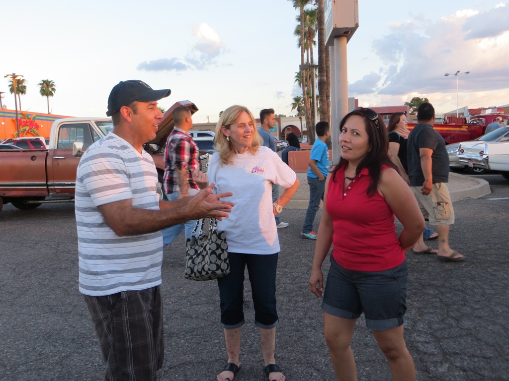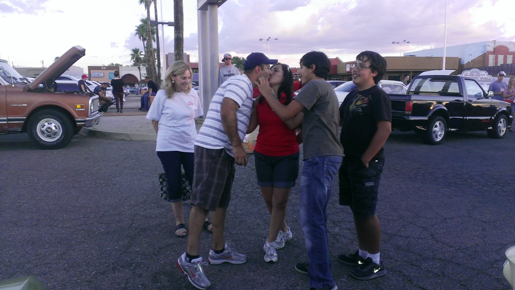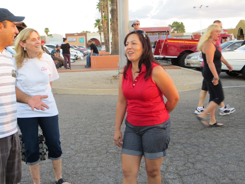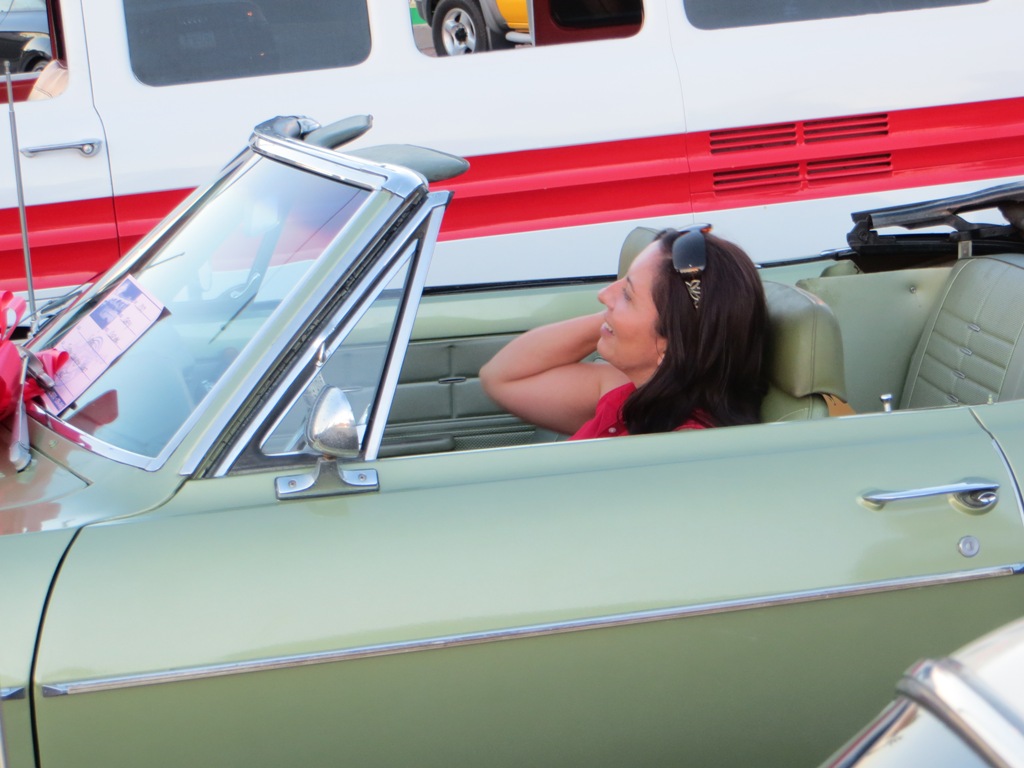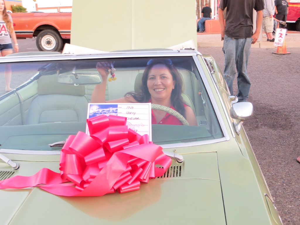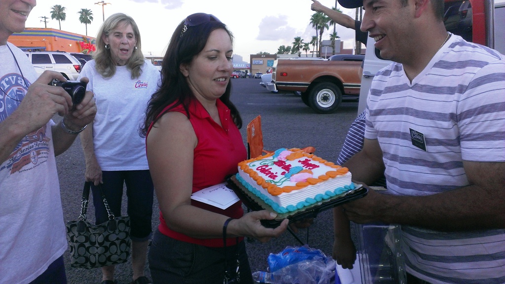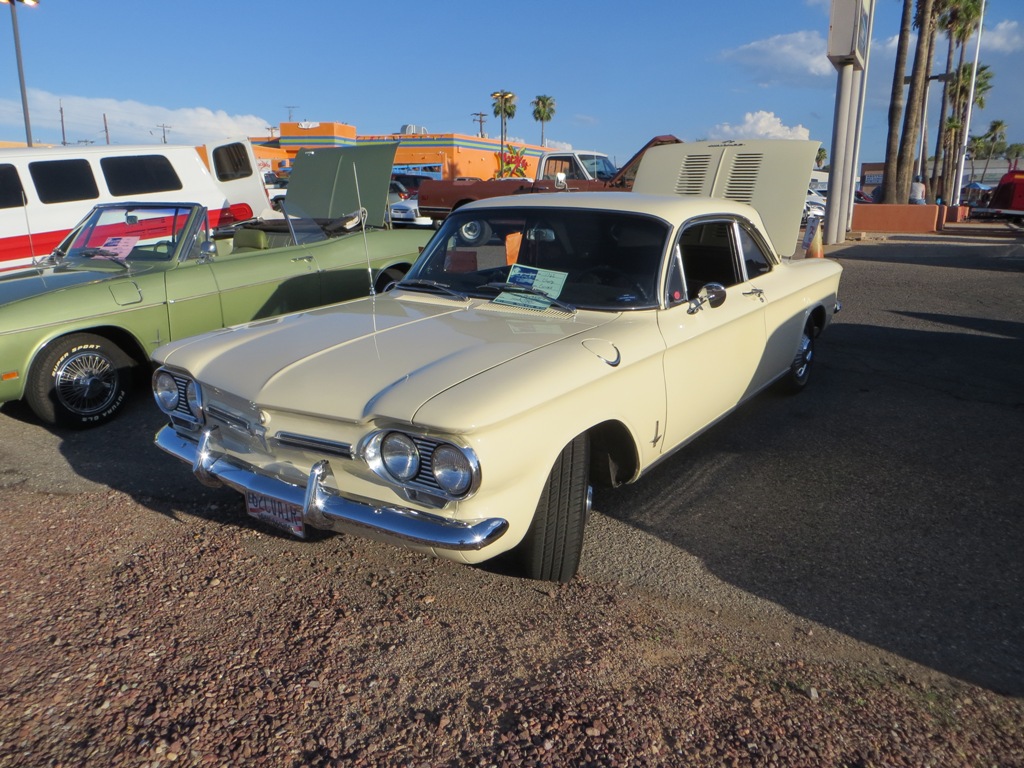 TCA showed up at Little Anthony's Diner on Saturday night, July 19, 2014 with 5 Corvairs and a pickup truck. The treat of the evening was Gloria Trejo receiving a brand new 1969 Corvair convertible as a birthday present from her husband Frank.